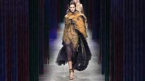 Rendas pretas, transparências estratégicas e vestidos estruturados trouxeram à passarela a feminilidade poderosa que sempre definiu a casa. A silhueta ampulheta apareceu valorizada, enquanto corsets, blazers ajustados e saias lápis reforçaram uma narrativa de força e sedução.