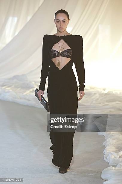 A seda aparece como contraponto textural ao couro mais robusto. Tecidos que escorregam pelo corpo, com brilho discreto, oferecem leveza ao conjunto mais pesado da estação. Essas transições entre materiais — da seda fluida ao couro firme — criam uma sensação de dualidade na coleção: dureza e suavidade coexistindo em harmonia.