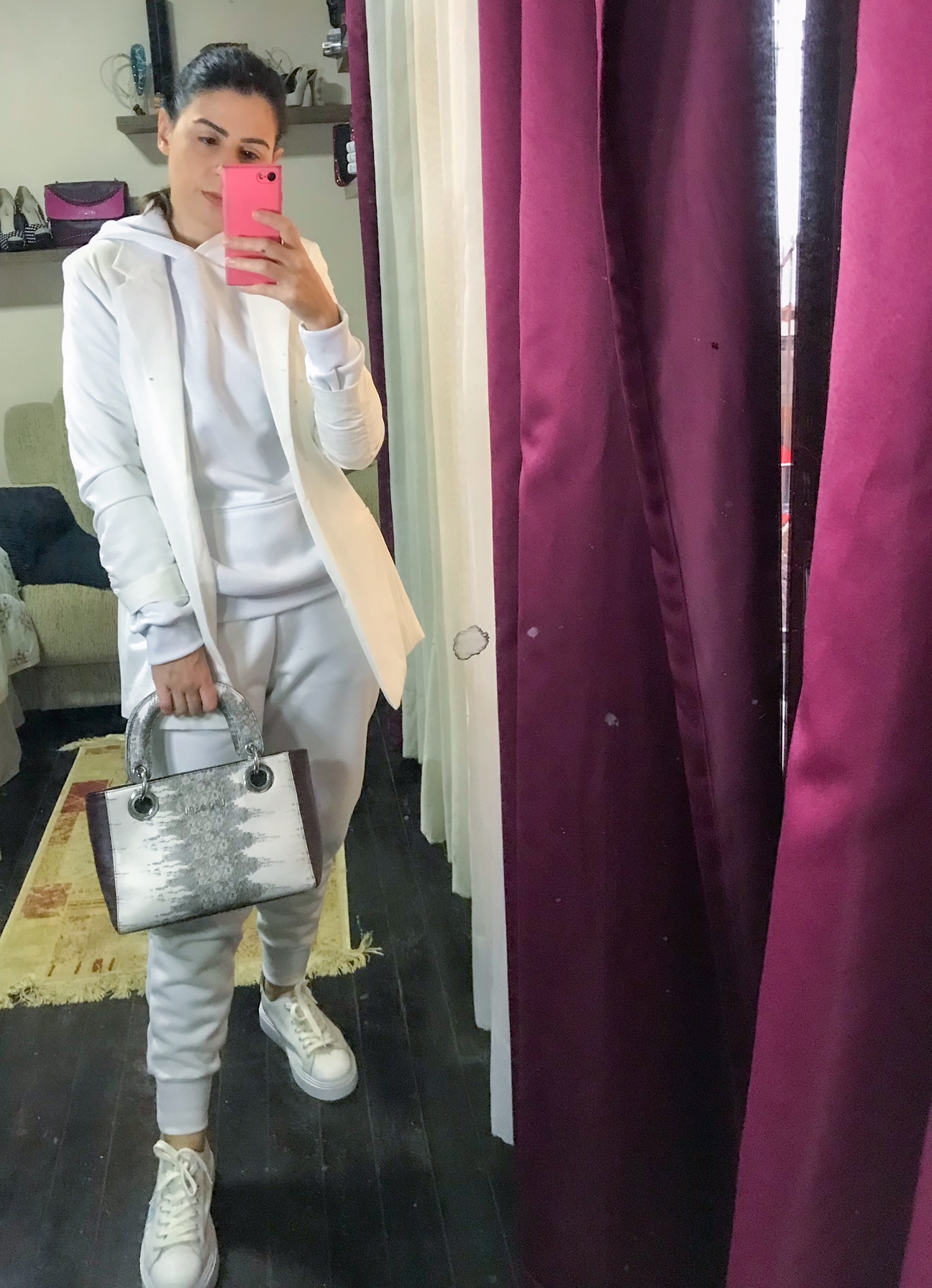 Moletom sempre foi e sempre será sinônimo de conforto e nada melhor do que deixar ele de forma mais estilosa. Um conjunto de moletom: calça e blusa, são perfeitos para combinar com um blazer. A cor branca trás elegância e deixa o look mais clássico e arrumado. A tática para combinar o moletom com blazer, é trazer o capuz para fora, dando assim uma continuidade ao look.