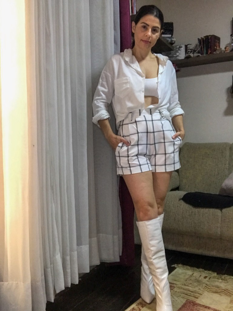 Top e short alfaiataria: Dapdem – Camisa: Sucessione e bota: New Elegance Top: Dapdem – Blazer: Renner – Calça: antiga Hellen Carolina – Sapato: Loucos & Santos