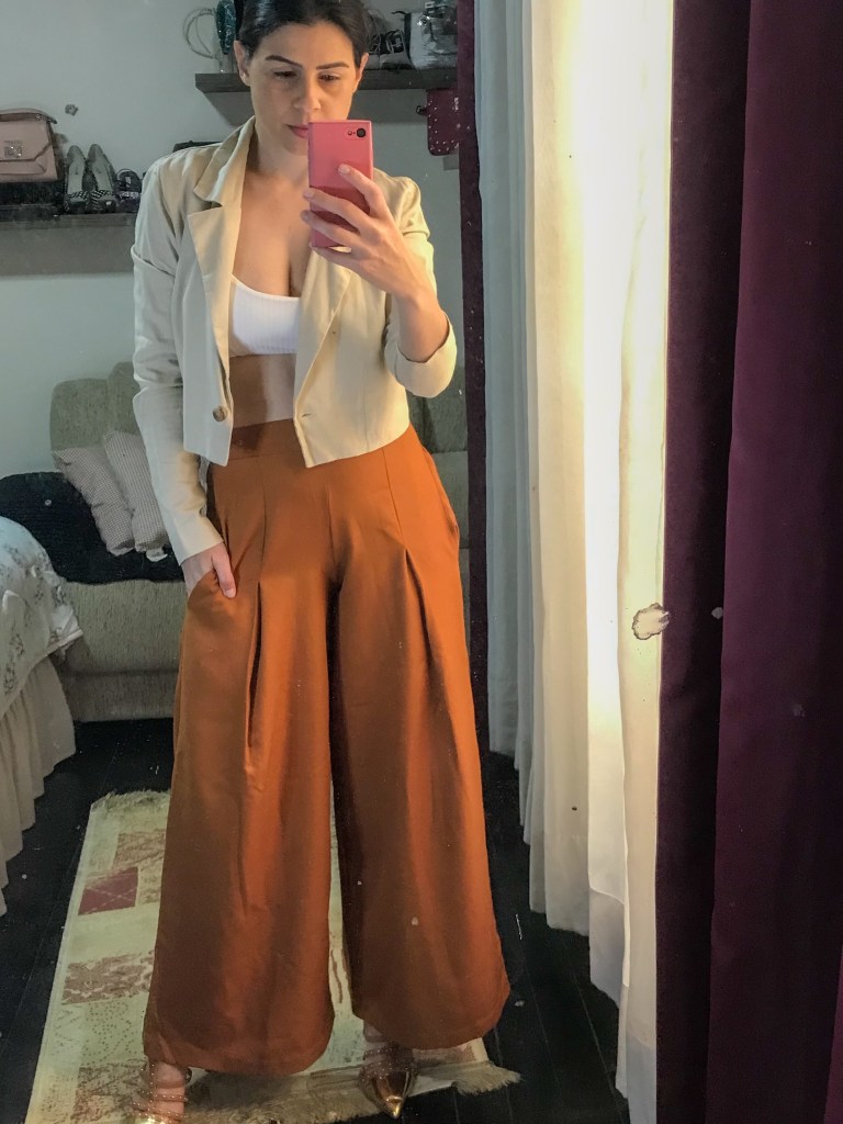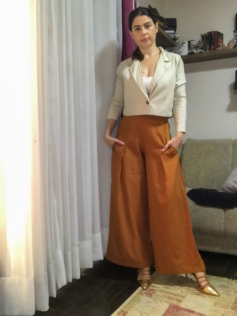 O top branco possui uma versatilidade incrível, feito com malha canelada, sustenta super bem e combina com qualquer estação. Nessa transição de estações, onde o frio ainda está presente, combinei com um blazer cropped é uma calça pantalona. Fiz também uma variação de cores, mas como são cores neutras combinou perfeitamente.