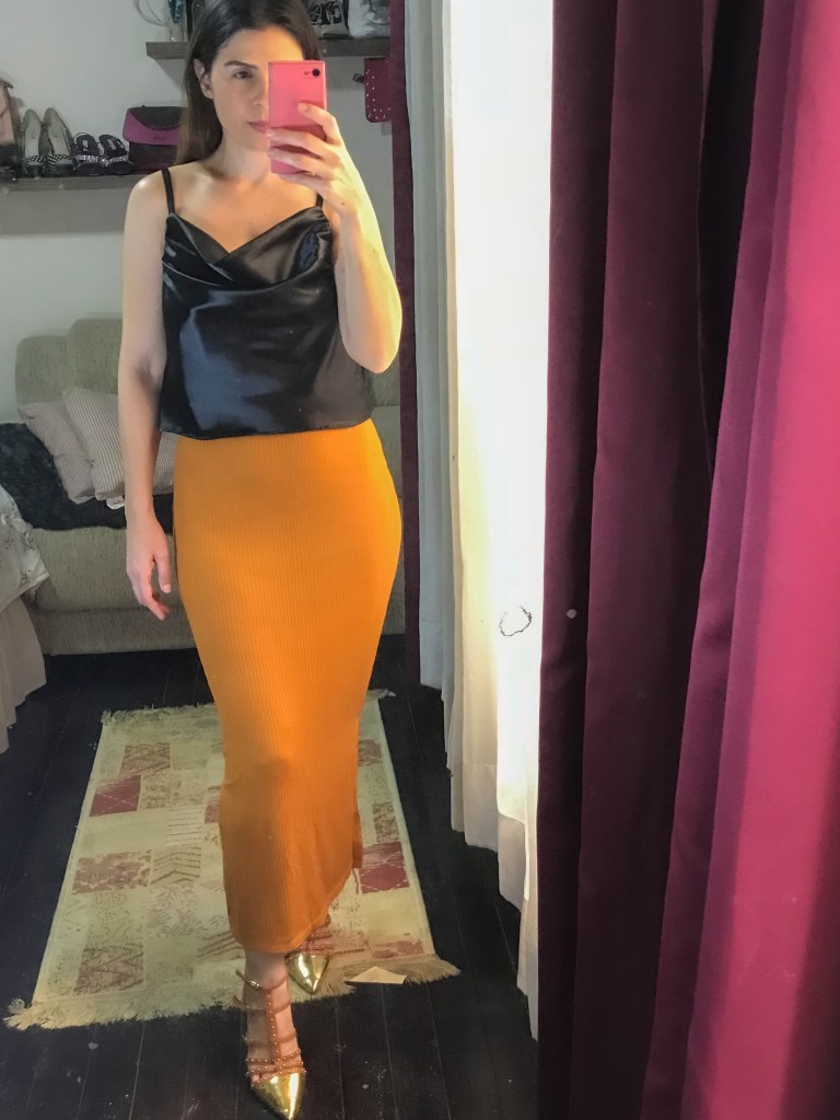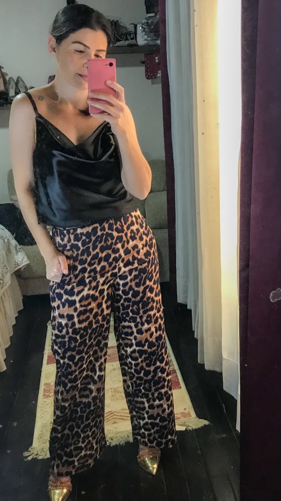 Escolhi a regata de cetim na cor preta, porque né…preto combina com tudo. A qualidade do tecido é algo incrível, me sinto valendo milhões. Brinquei com uma calça com animal print e também com uma saia da própria Dapdem.