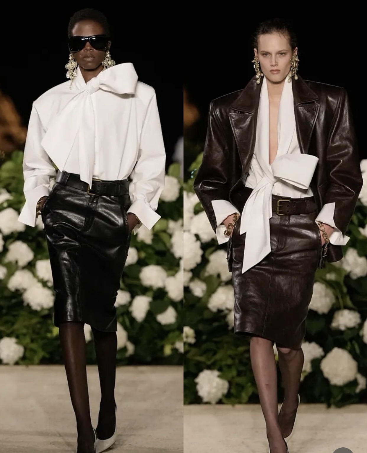 A alfaiataria aparece desconstruída: blazers de couro queimado, cortes que desafiam a rigidez, contrastes entre formas firmes e tecidos transparentes. Transparências e renda emergem como elementos chave, muitas vezes tensionadas com jaquetas pesadas ou denim destruído. Acessórios que marcam presença: botas estilo cowboy pontiagudas, brincos grandes (alguns “moon-ear” ou que cobrem partes da orelha), bolsas Camero oversized. A paleta de cores jogou entre o escuro (couros queimados, pretos saturados) e o contraste claro (alfaiataria branca, rendas translúcidas), com texturas que variavam entre o áspero e o liso, o bruto e o sensual.