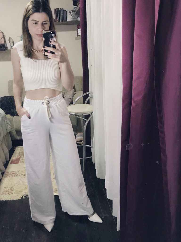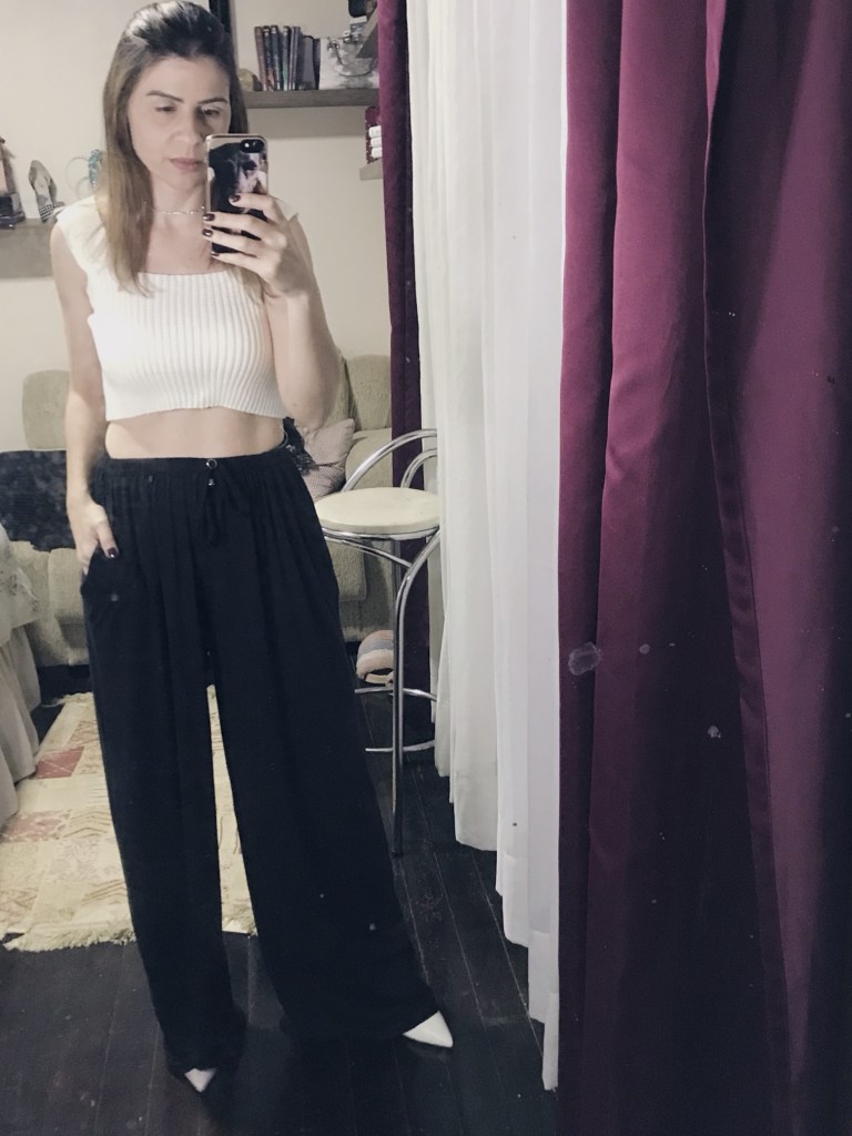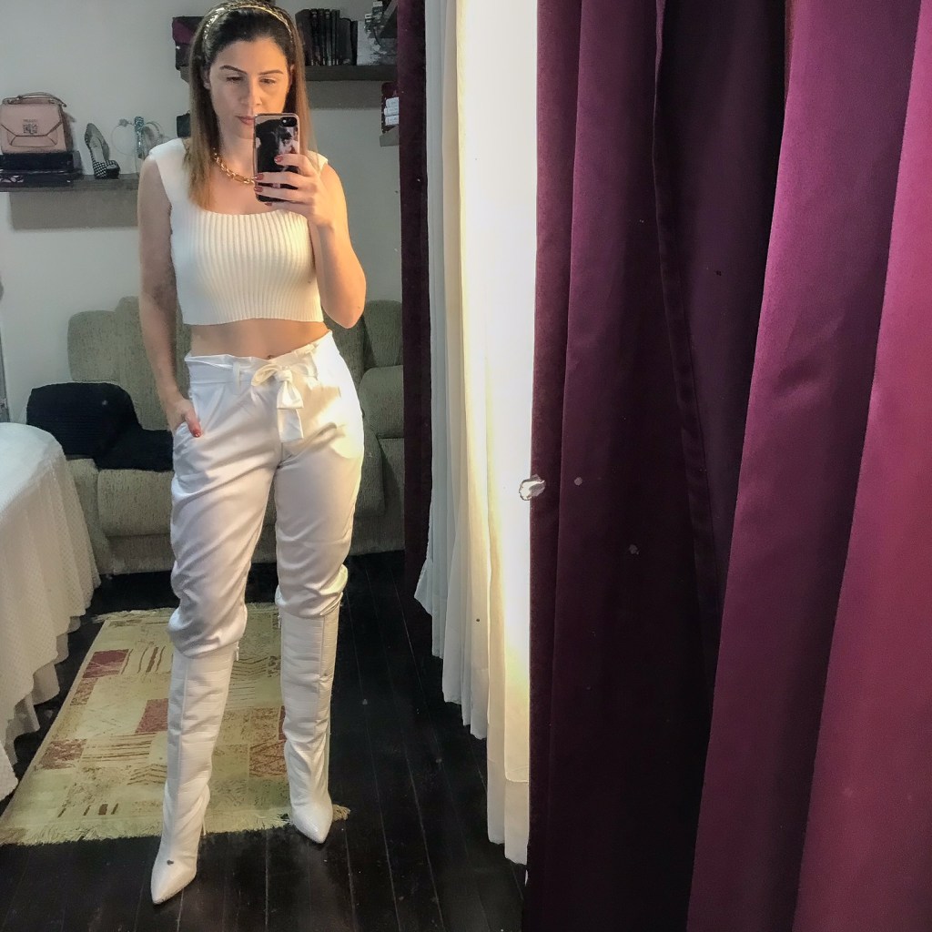 Neste look, apostei no cropped. O cropped trás um ar bastante primaveril. Na calça, adicionei um toque que está bem em alta no momento, o estilo bombacha. O estilo bombacha nada mais é, do que, colocar a bota por cima da calça deixando ela mais solta. Isso dá um toque moderno ao look.