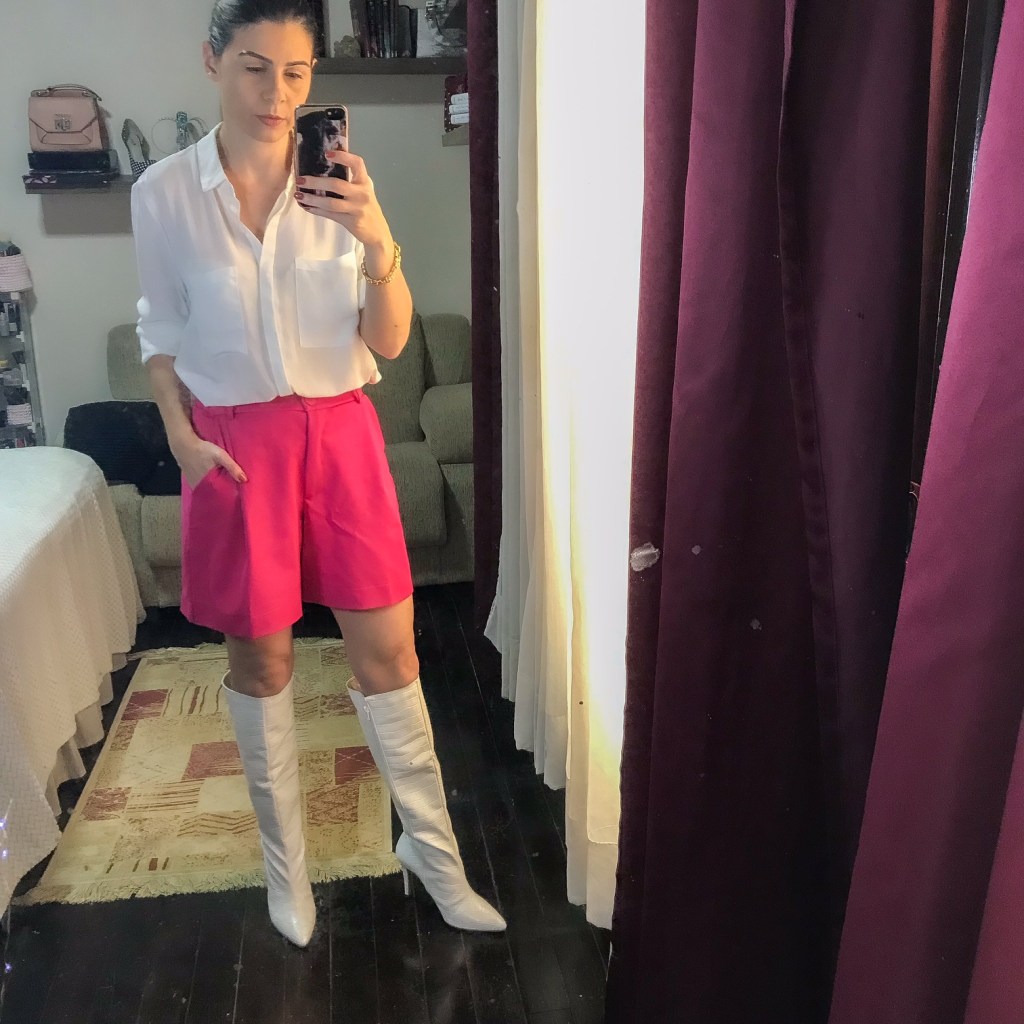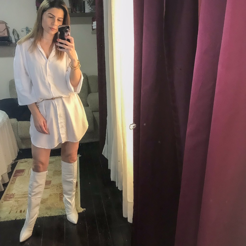 A camisa oversize, que pode ser usada como vestido, entrou nessa estação com o pé direito e parece que veio para ficar. Apostei em um cinto fino para dar mais elegância ao look e mais forma. Reparem como a bota branca deixou muito mais clássico.