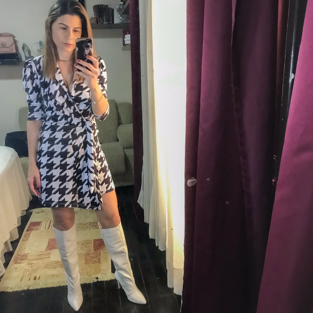 Esse look é o meu preferido. Criei um look mais night out, com esse blazer vestido e agreguei a bota branca. Todo o charme do blazer vestido, se juntou com a bota branca e algumas jóias e elevou o look.